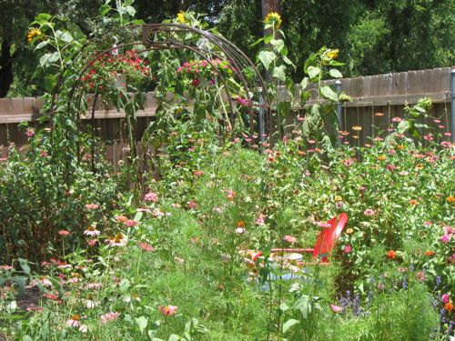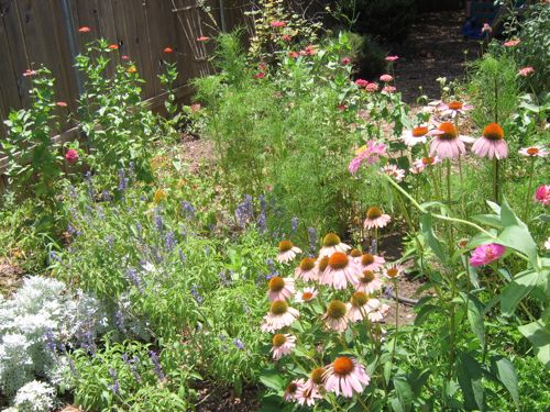 The view in the photo above is from my patio to the east corner of the yard. Most of these flowers were planted from seed. I like for the different varieties to blend into one another without borders.