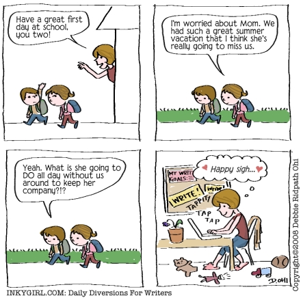 The comic was created by Debbie Ridpath Ohi and can be found on the web at Inkygirl: Daily Diversions For Writers. Another great site is Will Write For Chocolate, also created by Ms. Ohi.  When I first read the strip, I thought she might be hiding out on my block and using me for inspiration. I love writing all day.