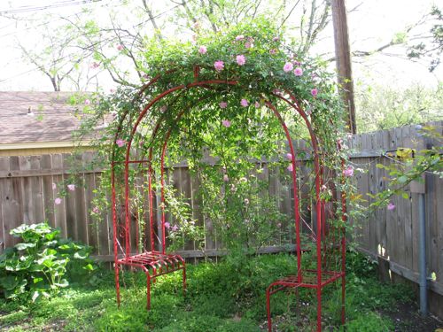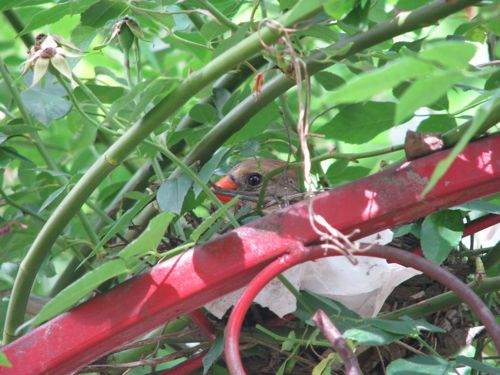 A pair of cardinals built a nest in the bubble gum blossoms of our Old Blush rose. Their castle is a pastel fortress. Dad sings from the top of a pecan tree, while mom incubates. Yesterday, a mockingbird made a run at her, and Red swooped to the rescue. The mockingbird is bigger than the cardinal, but Red has love on his side.