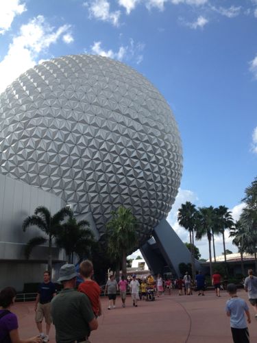 We ate our sack lunch under Spaceship Earth. The geodesic dome, invented by Buckminster Fuller, is the symbol of Epcot. Ray Bradbury worked on the design. Two icons built another, so-to-speak. My kids dubbed it, God’s golf ball. The structure dwarfs everything–even at Disney.