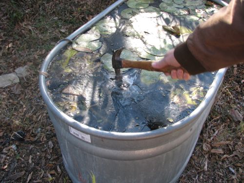Birds were standing on the surface pecking away at the ice. I was sure our goldfish could use a shot of oxygen. A few minutes later, tool in hand, Bacon cracked the surface.breaking the ice1